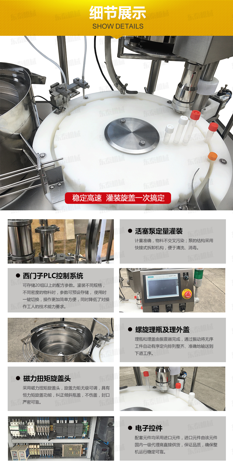 6、采用磁力扭矩旋蓋頭,旋蓋力矩?zé)o級(jí)可調(diào),具有恒力矩旋蓋功能,糾正傾斜瓶蓋,不傷蓋,封口嚴(yán)密可靠;