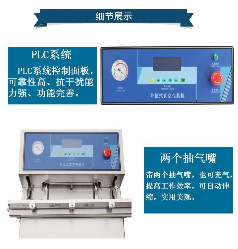 電源 220/50HZ 電機(jī)功率 1KW 熱封功率 0.95KW 抽氣速率 20m³/h 充氣速率 0.85mpa